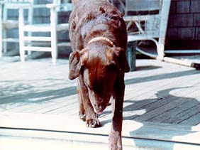 More information on Walter below...... Walter was born in August 1985 at 2600 Headquarters. Back then we were a tiny three sheet newsletter and were hardly deemed a threat by anyone. Well, as everyone knows, that's all changed. Walter is the son of Reuther and Coa. Reuther is a Yellow Lab bitch who currently resides in the Bay Area. Coa is a Chesapeake Bay Retriever whose whereabouts are currently unknown. He is wanted for two and a half years of unpaid child support. Considerable confusion was caused at Walter's birth when he turned out to be the only puppy in the litter. Indifferent to humans in his first few weeks, his attitude changed profoundly when he discovered where dog food really comes from. Over the years, Walter has been a terrific inspiration to us. Always willing to go for a walk, play frisbee, or dive into the harbor to retrieve sticks that kept falling in, Walter had what we consider to be the true hacker spirit. Early in his life, while being walked on a rural street, Walter was hit by a pickup truck. Actually, Walter hit the truck more than it hit him (Walter was in pursuit of a cat) but it was still a sobering experience for all concerned. Other than a few scrapes, he escaped unscathed. Occasionally, Walter would get into things he shouldn't have gotten into, like garbage. One time he raided something particularly noxious and came down with a condition known as bloat. He had to be taken to the animal emergency room where his stomach was pumped multiple times. The vet would occasionally come into the waiting room with assorted objects they had pumped out to ask if we needed them. Once again, Walter survived a brush with death. Having been brought up in the country, Walter was used to roaming the neighborhood. He became known to all and respected by most. He became infatuated with a neighborhood dog who, unfortunately for him, turned out to be a Chihuahua. Over the years, every time the Chihuahua went into heat, Walter would go completely crazy, breathing heavily, howling, and camping out outside the Chihuahua's house. One day, Walter disappeared and all attempts to find him were futile. Two days passed and there was still no sign of him. Concerned that something from his father's shady past had caught up with him, we printed up hundreds of flyers and distributed them to the entire neighborhood. On the third day, we started getting calls which placed Walter at a location some distance away. We sent a team to investigate and were greeted by homeowners delighted that we had come to remove the mysterious howling brown dog. Walter, looking emaciated, had found a new house to camp in front of. But, as it turns out, it was the same dog. The Chihuahua had moved. It was determined at that point that Walter should be fixed so that he wouldn't continue to be manipulated by the Chihuahua. Even though he was more than five years old, the risk of weight gain was better than his continued unrequited love. Unfortunately, the weight gain was more than anyone had anticipated and Walter was soon known as the heaviest dog in the neighborhood, physically and spiritually. While he was slowed down a bit, he never lost his enthusiasm, his zest for living, or his hacker skills. He came to accept cats as potential allies, casting aside his earlier youthful brashness and replacing it with a more tolerant, open-minded policy. October 27, 1995 It was dusk and Walter was being walked. Since there is minimal traffic, leashes are rarely used in the neighborhood. Walter was trained to return to his master's side whenever a car approached. He was coming back from across the street to do this but the car was speeding. He was hit hard as the car tried to stop. A crowd gathered. It happened right outside the Chihuahua's house. The weekend was spent determining the extent of Walter's injuries. After multiple tests, major internal damage was ruled out. But Walter had severe rear hip and leg damage. And, because of his weight, there was a grim prognosis concerning his ability to walk or stand in the future. A decision had to be made regarding his future. An operation would cost thousands of dollars and might not make any difference. The vets told us that we should consider putting him to sleep if he was facing a life of pain. November 1, 1995 Walter was drugged out most of the time because of the pain and the need to do further testing. We decided to bring him to a hip surgeon who would give us a sense of what he was in for. We drove for more than an hour and carried him in on a stretcher. He was almost totally knocked out but would occasionally stare sadly at one of us. This would be the moment where we would have to make a painful decision. The surgeon looked him over and said, although his injuries were bad and his weight was a handicap, he thought he had a fighting chance. That was all we needed to hear. Surgery was scheduled for the 3rd. Mid November 1995 After the surgery, Walter had a long road ahead. He was unable to move on his own. The only way we could "walk" him was with two people - one would pull on a leash while the other lifted a sling that supported his rear legs. The pain was so severe that he would snap at the leash until the sling was holding him. We made up schedules around the clock and tried to make him as comfortable as possible. He was panting a lot and whined frequently. But we also noticed something that hadn't happened in a long time - his tail wagged slightly. Late November 1995 Walter had been on a super restrictive diet and the result was significant weight loss. While he had been 110 pounds at the time of the accident, his weight now was around 75 pounds. This was a very positive development. It had also become less painful for him to be pulled up on his sling; in fact one person could now do it without the leash. He was starting to sleep peacefully now and started to seem a lot more like his old self. It was obviously frustrating to him that he couldn't stand up but he was abl