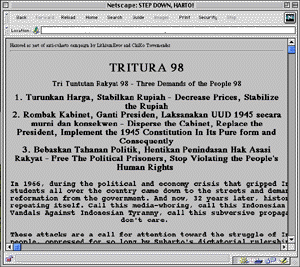 Monday, January 19, 1998 Indonesian web sites were hacked yet again on January 18, 1998. All kinds of governmental and commercial sites were taken over. Some were fixed quickly. Others stayed hacked for much longer.